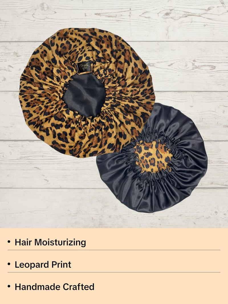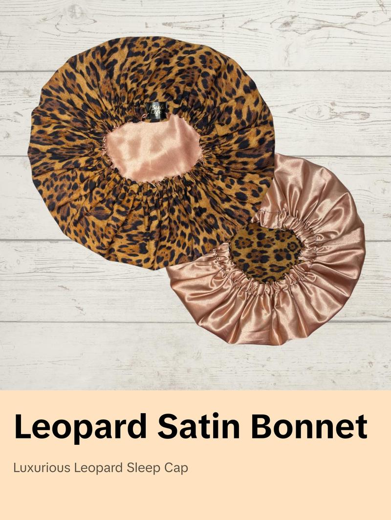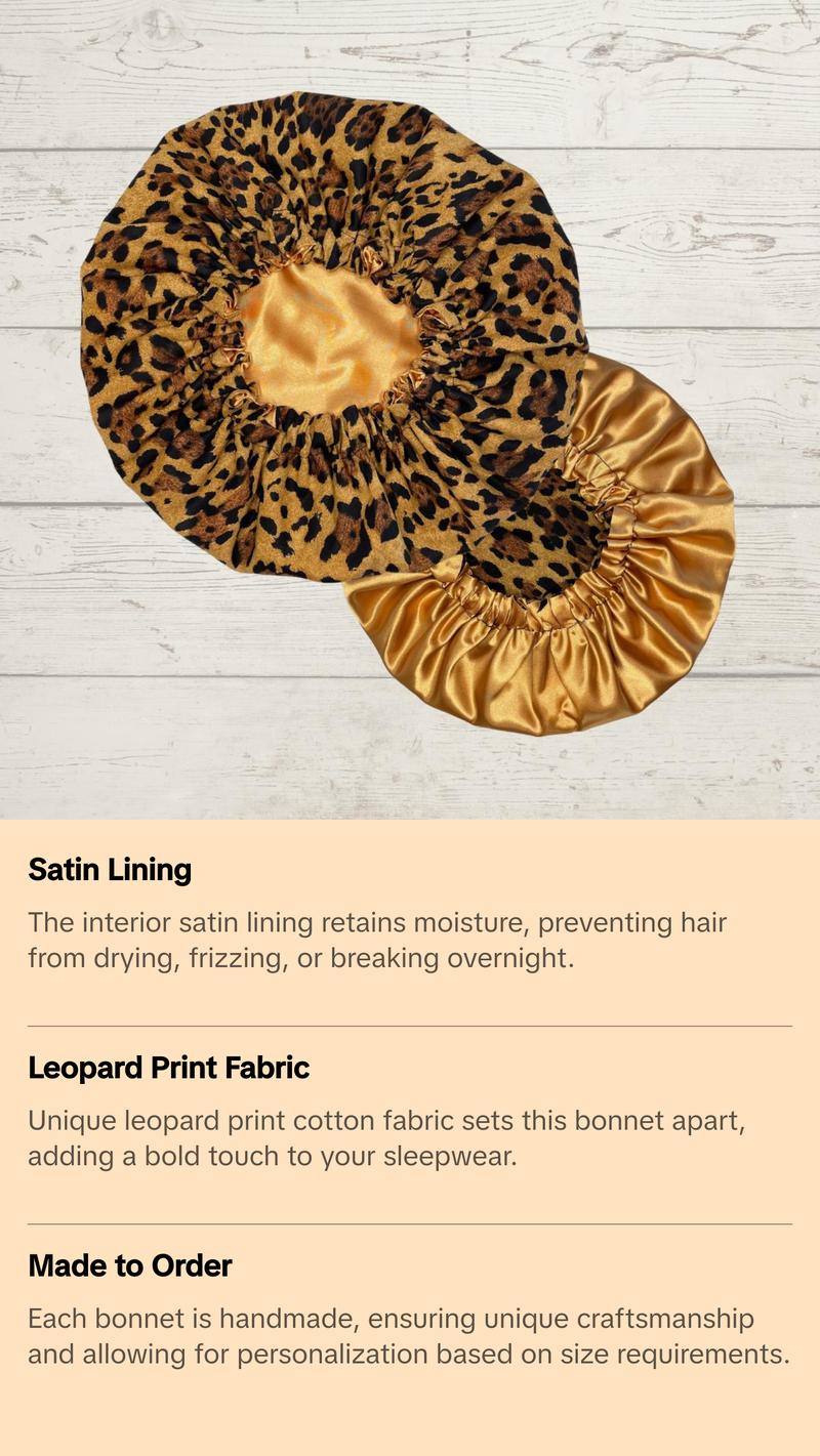 Handmade Satin lined bonnet with a beautiful leopard print cotton fabric, lined in satin. The interior satin material keeps hair from drying, frizzing, and breaking while also holding in moisture while you sleep 💕!